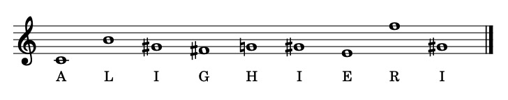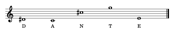 Oltre a musicare la canzone dantesca, la colonna sonora ha previsto la composizione di brani ad hoc legati a doppia mandata a Dante che ho pensato di strutturare in modo particolare. La costruzione dei pezzi si basa sull’idea della trasformazione della lettera alfabetica in nota con il principio associativo A = Do; B = Do#; C = Re, etc. Così facendo il nome Dante è stato mutato nella sequenza