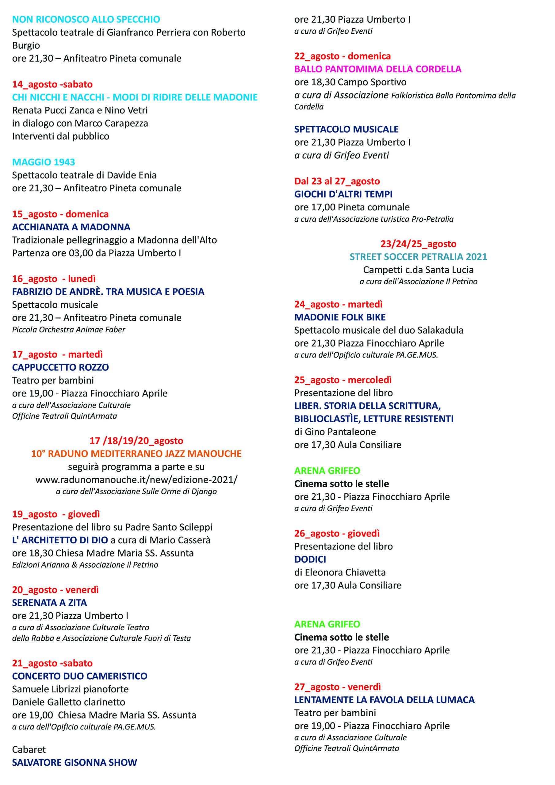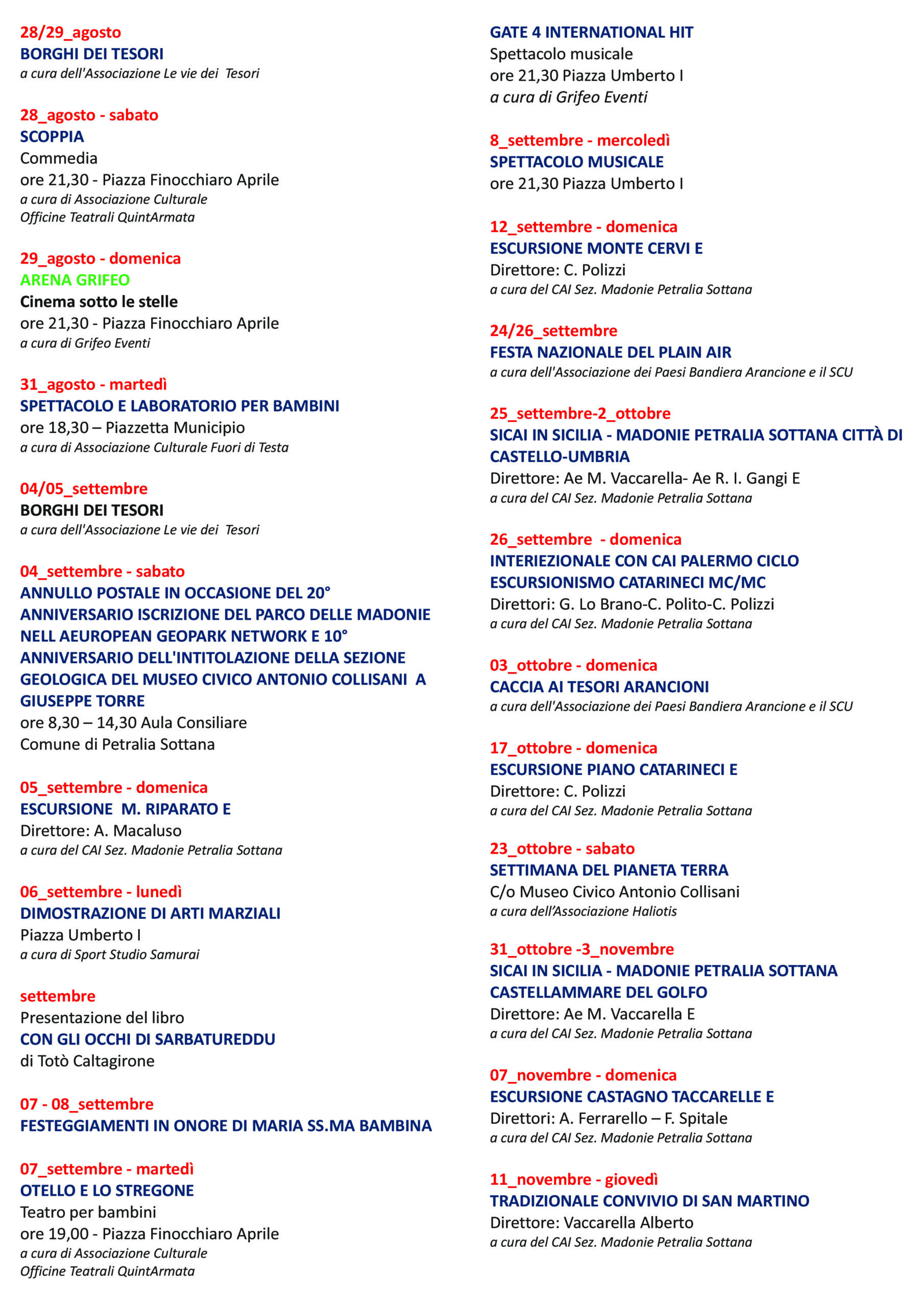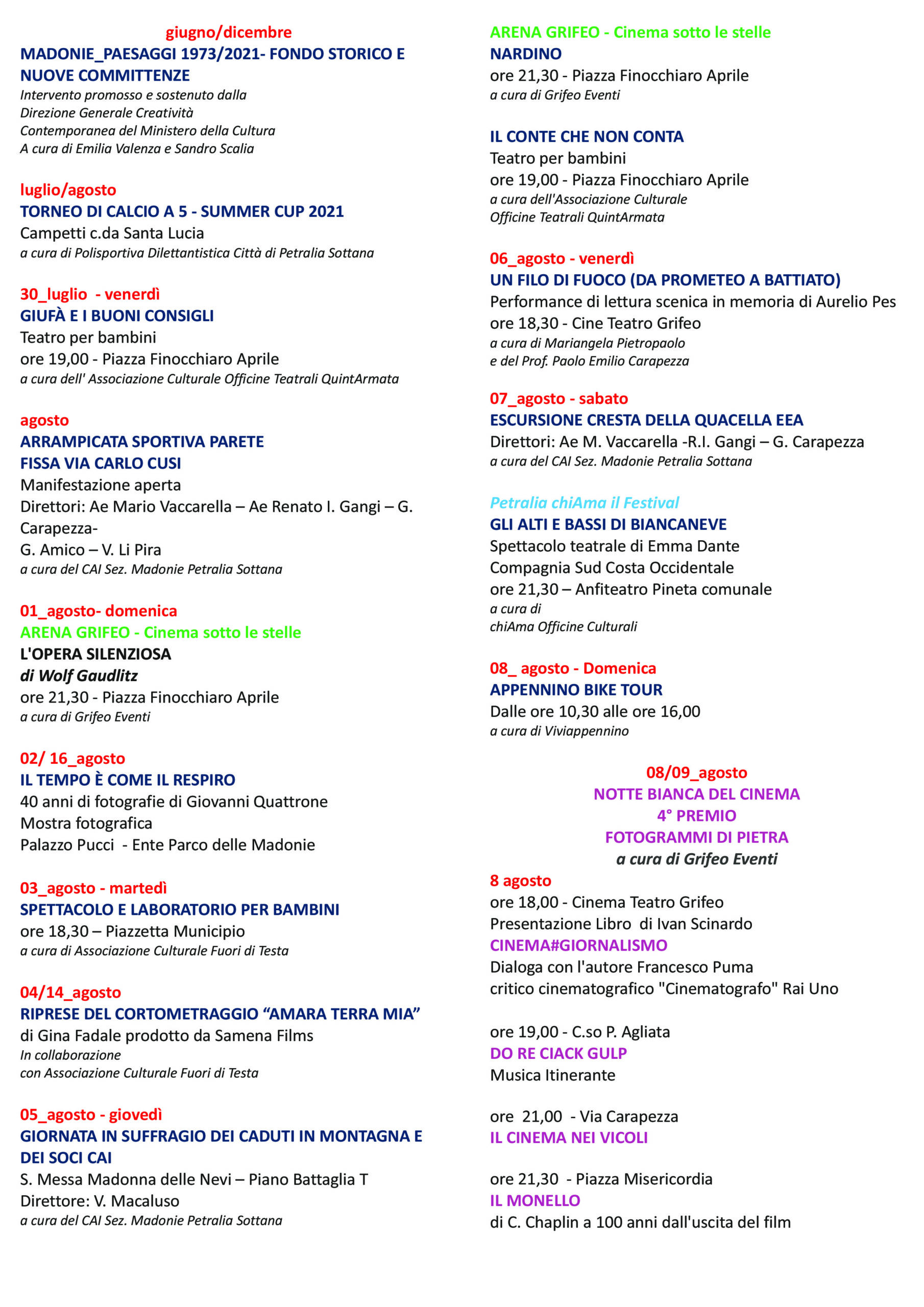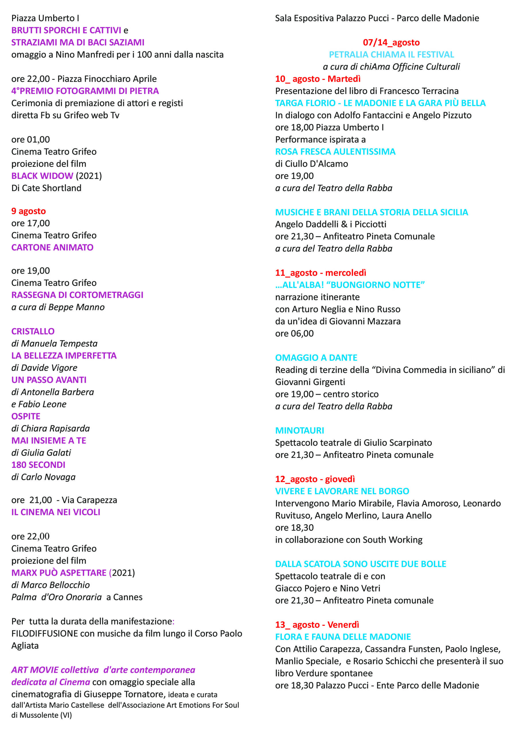 Dopo l’approvazione del bilancio, cosi come anti altri comuni madoniti, anche Petralia Sottana,ha reso noto il cartellone degli eventi che avranno luogo fino a settembre.Tanti gli appunti e gli eventi oramai che caratterizzano l’estate petralese,in sicurezza e secondo le nuove disposizioni in materia di covid:dal cinema(con la Notte Bianca del Cinema) al ritorno della Raduno Jazz Manouche(dopo lo stop dell’anno scorso)e poi tanto teatro,per grandi e piccini.Ma ecco nel dettaglio tutto il programma: