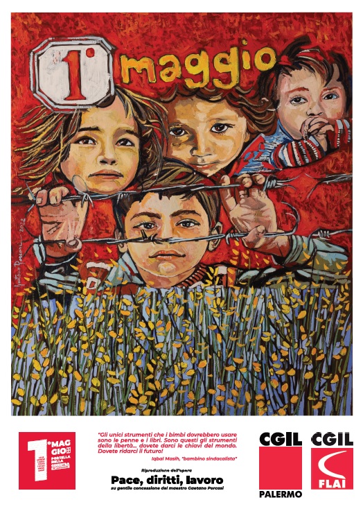 E’ l’immagine che Gaetano Porcasi, pittore dell’impegno civile, che nelle sue opere da sempre affronta il tema della lotta alla mafia legando arte e denuncia, ha donato alla Cgil Palermo e alla Flai per realizzare un manifesto per il Primo Maggio, che quest’anno è dedicato al Lavoro e alla Pace.