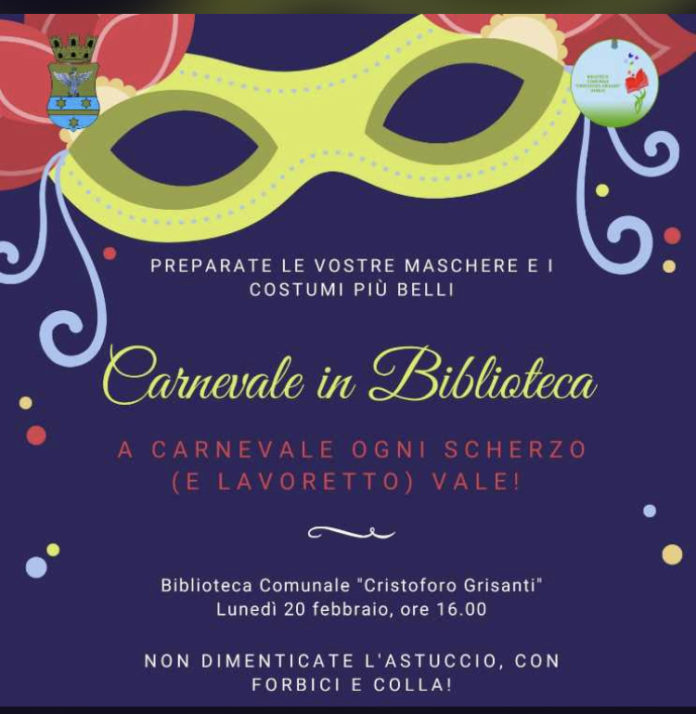 Lunedì pomeriggio, il Carnevale si festeggia in maschera presso la Biblioteca Comunale con letture e attività creative per bambini, dalle ore 16.00.