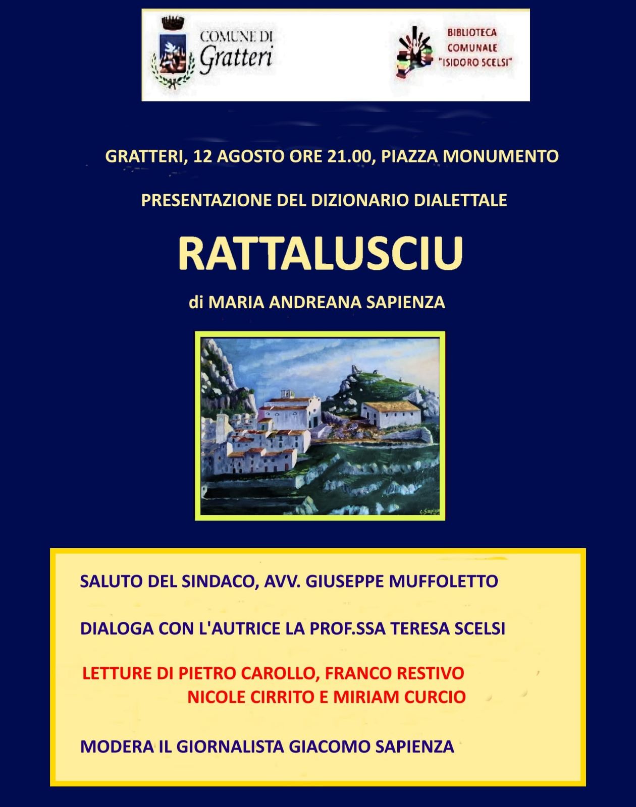 Su iniziativa del Comune di Gratteri e della Bibioteca Isidoro Scelsi, verrà presentato sabato 12 agosto a Gratteri il dizionario dialettale di Maria Andreana Sapienza, “Rattalusciu”.L’appuntamento per residenti e turisti è alle ore 21:00 in piazza Monumento.