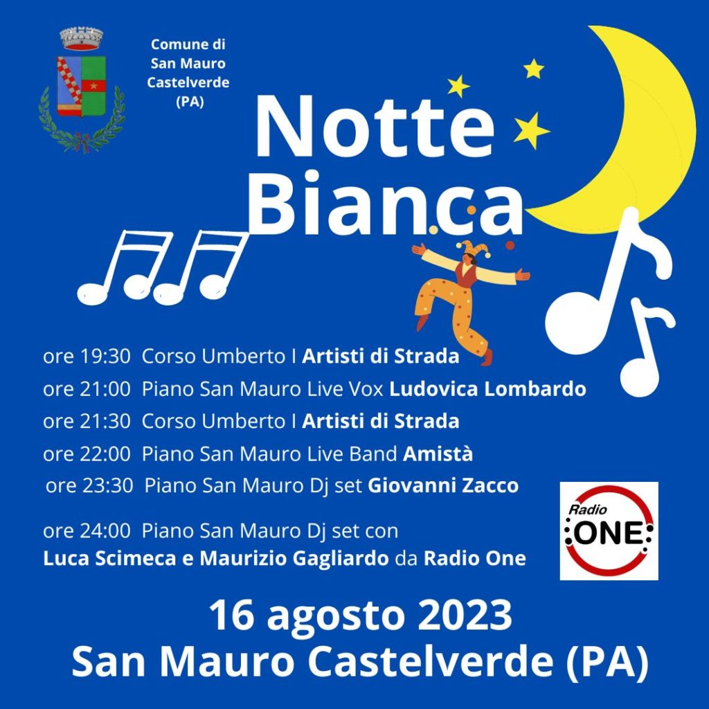 Tra gli eventi promossi dal Comune di San Mauro Castelverde oggi è in programma nel cartellone dell’Estate Maurina 2023 la “Notte Bianca”: sono previsti artisti di strada lungo il centro storico in Corso Umberto I, l’esibizione canora di Ludovica Lombardo, la band “Amistà” che suonerà dal vivo balli di liscio, il dj maurino Giovanni Zacco, in conclusione il dj set di Luca Scimeca e Maurizio Gagliardo da Radio One.