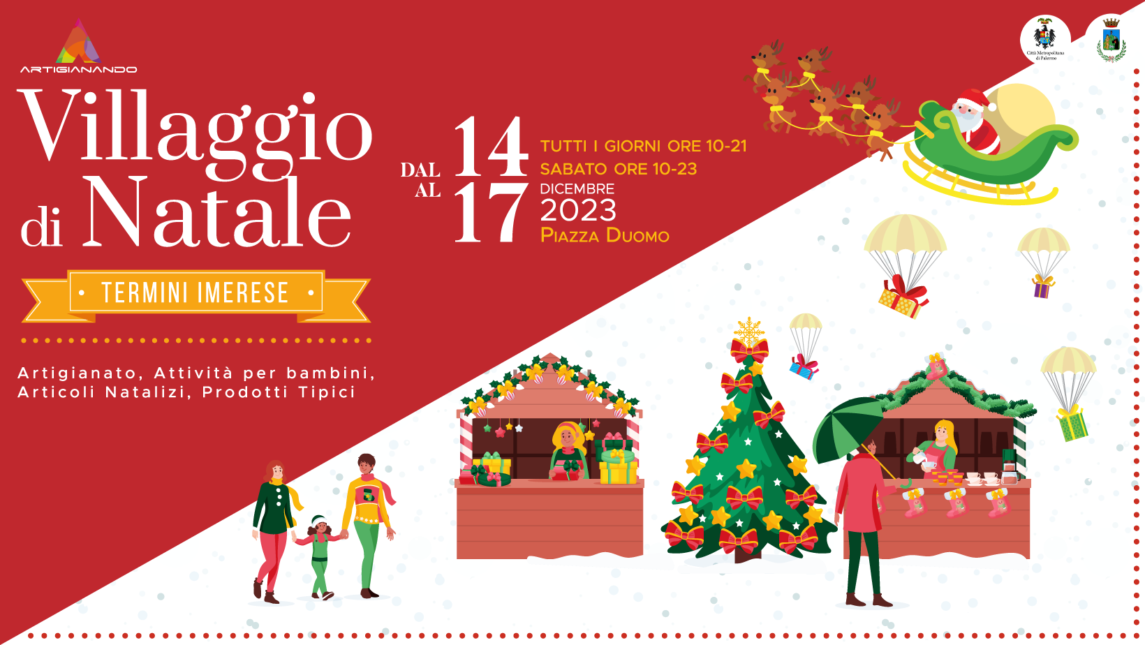 Il Natale è oramai alle porte e come ogni anno diverse sono le fiere, i mercatini tradizionali, gli addobbi e i festeggiamenti che si organizzano per annunciarne l’arrivo. Anche a Termini Imerese fervono già – grazie alla recente collaborazione nata tra il Comune e l’Associazione Artigianando – i preparativi per la fiera di Natale. Il villaggio di Natale aprirà alle 10:00 di giovedì 14 dicembre e proseguirà, tutti i giorni, fino a domenica 17 dicembre, seguendo i seguenti orari: giovedì, venerdì e domenica dalle 10 alle 21, sabato dalle 10 alle 24 (Ingresso gratuito).