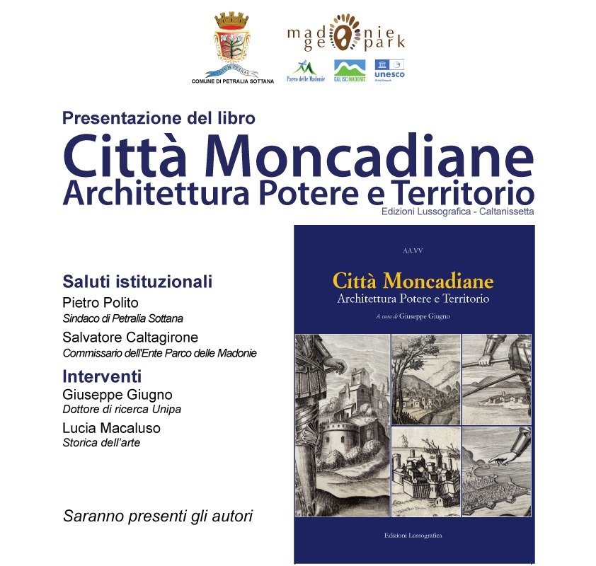 Il volume “Città Moncadiane. Architettura, Potere e Territorio” di Giuseppe Giugno,verrà presentato a Petralia Sottana,oggi giovedì 1 agosto alle ore 17.30, nell’Aula Consiliare del Palazzo Municipale | Corso Paolo Agliata, 50 |.Presenti, oltre l’autore, il sindaco Piero Polito,il Commissario del Parco delle Madonie, Salvatore Caltagirone e Lucia Macaluso,storica dell’arte.