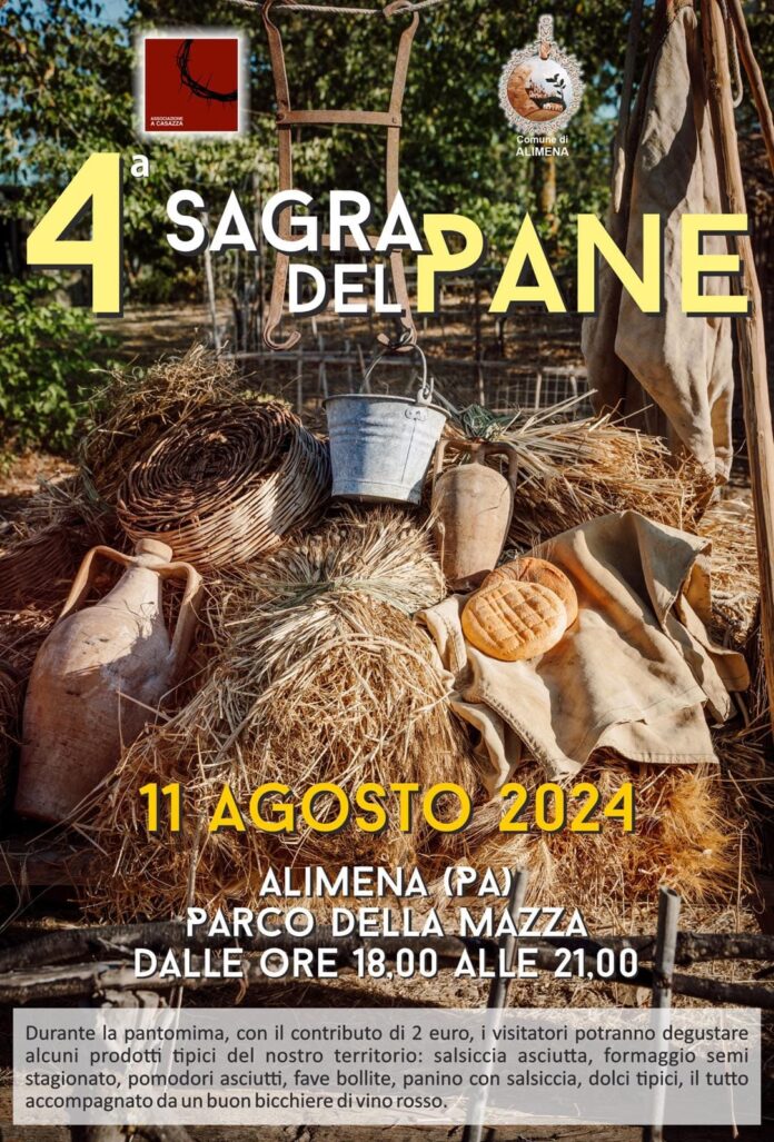 Oggi 11 Agosto ad ALIMENA presso il PARCO DELLA MAZZA dalle ore 18:00 alle 21:00 si svolgerà la Sagra del Pane,giunta alla quarta edizione.Durante la pantomima, che sarà allietata dal Gruppo Folk “Imachara” , i visitatori con un contributo di 2 euro, potranno degustare vari prodotti tipici del nostro territorio: salsiccia asciutta, formaggio semi stagionato, pomodori asciutti, fave bollite, panino con salsiccia, dolci tipici e un buon bicchiere di vino rosso.