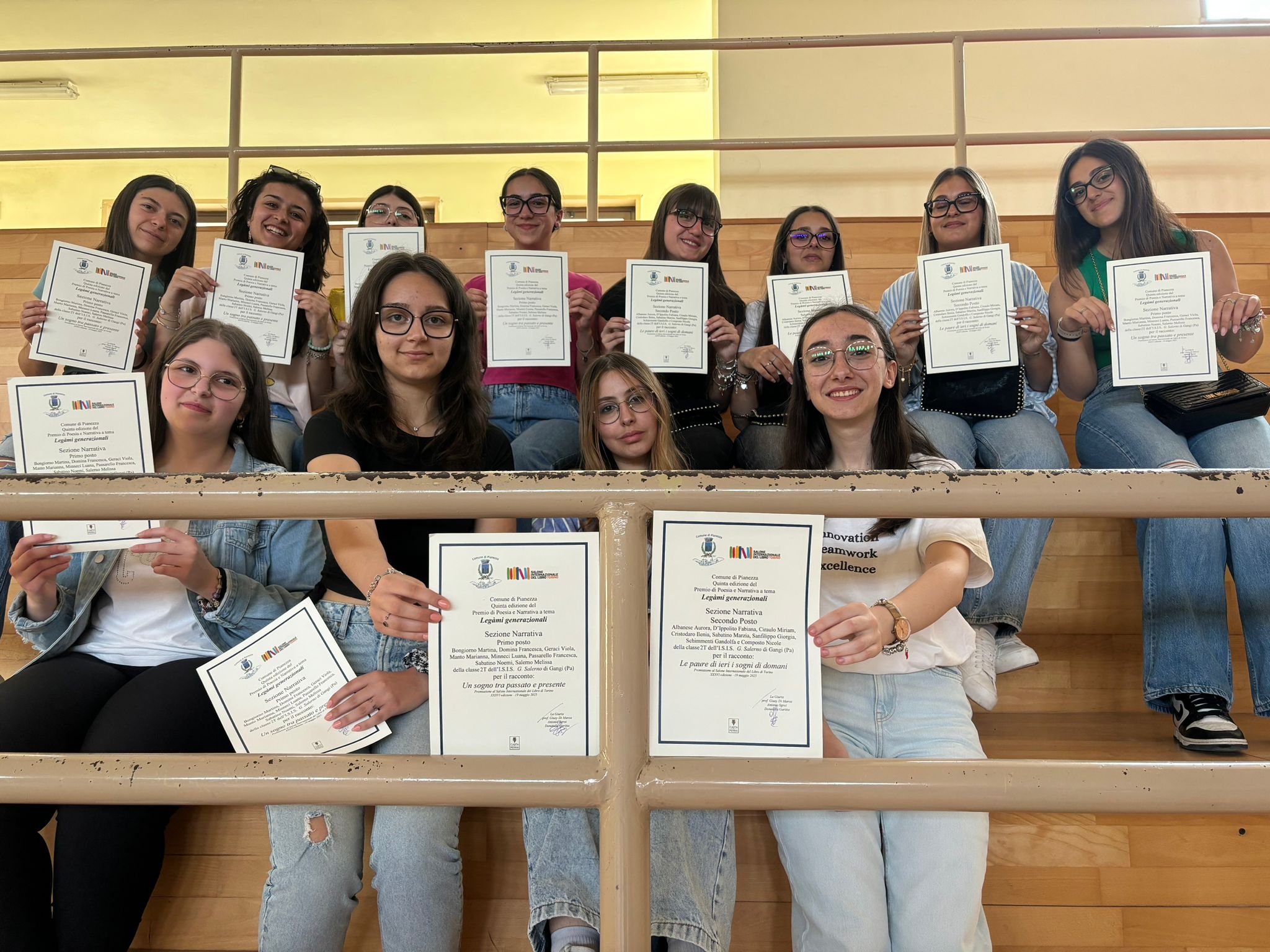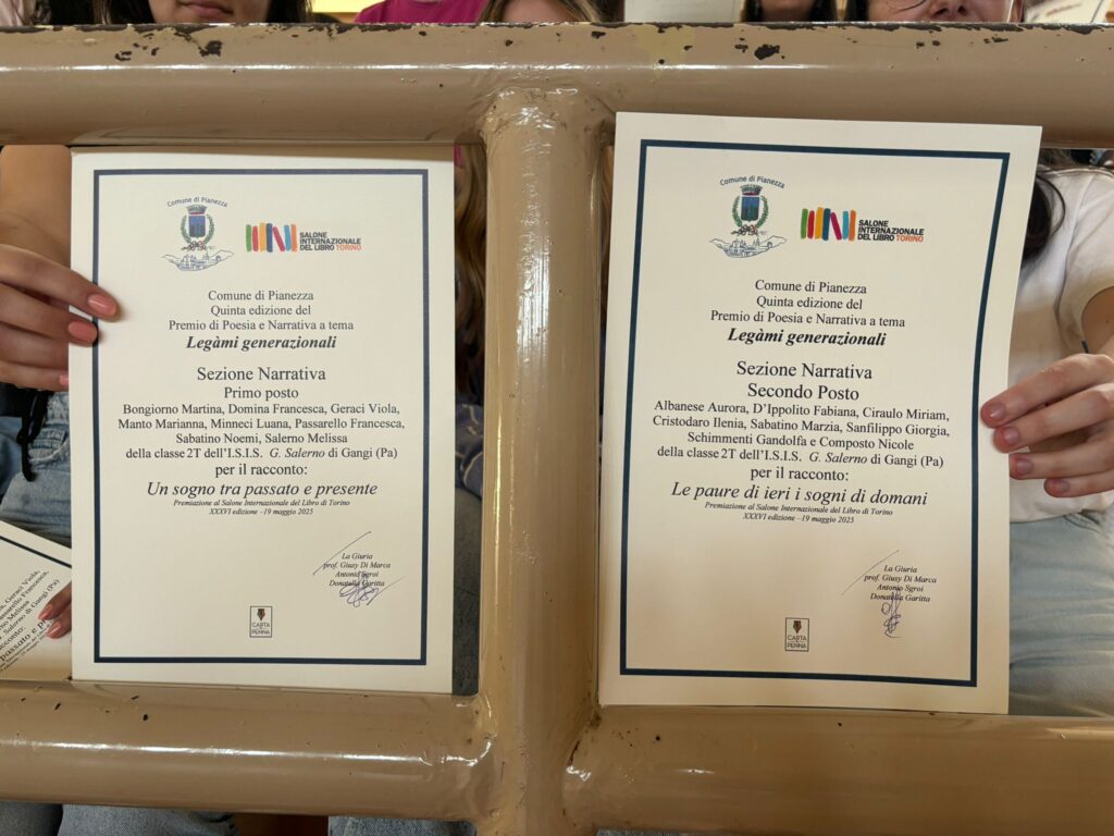 Grandi soddisfazioni per l’Istituto “G.Salerno” di Gangi, che conquista il podio di due prestigiosi premi letterari.Lo scorso 19 maggio al Salone internazionale del libro di Torino, alle alunne della classe II T sono stati conferiti il primo e il secondo posto al “Premio letterario Comune di Pianezza”, gemellato con Gangi, per la sezione “Narrativa a tema”, presentando due racconti brevi sul tema “Un sogno tra passato e presente” e “Le paure di ieri, i sogni di domani”.Il 5 giugno, inoltre, gli alunni Mattia Spitale e Gaetano Blando della III A SIA hanno conquistato il secondo posto al “Premio letterario Stenio” promosso dall’omonima scuola superiore di Termini Imerese nella sezione poesia del triennio.